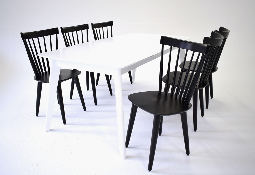 Spisegruppe i hvitt massivt gummitre / MDF med tilhørende 6 sorte pinnestoler.