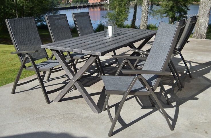 Robust og romslig spisebord i Shabby Chic-grå med stilige kryssben. Et bord hvor mange får plass, gjør seg bra på de litt større uteplassene. Det følger også med 6 Solana posisjonsstoler i lakkert antrasittgrå aluminium, rygg og sete i matchende tekstiler og armlener i aluminium.