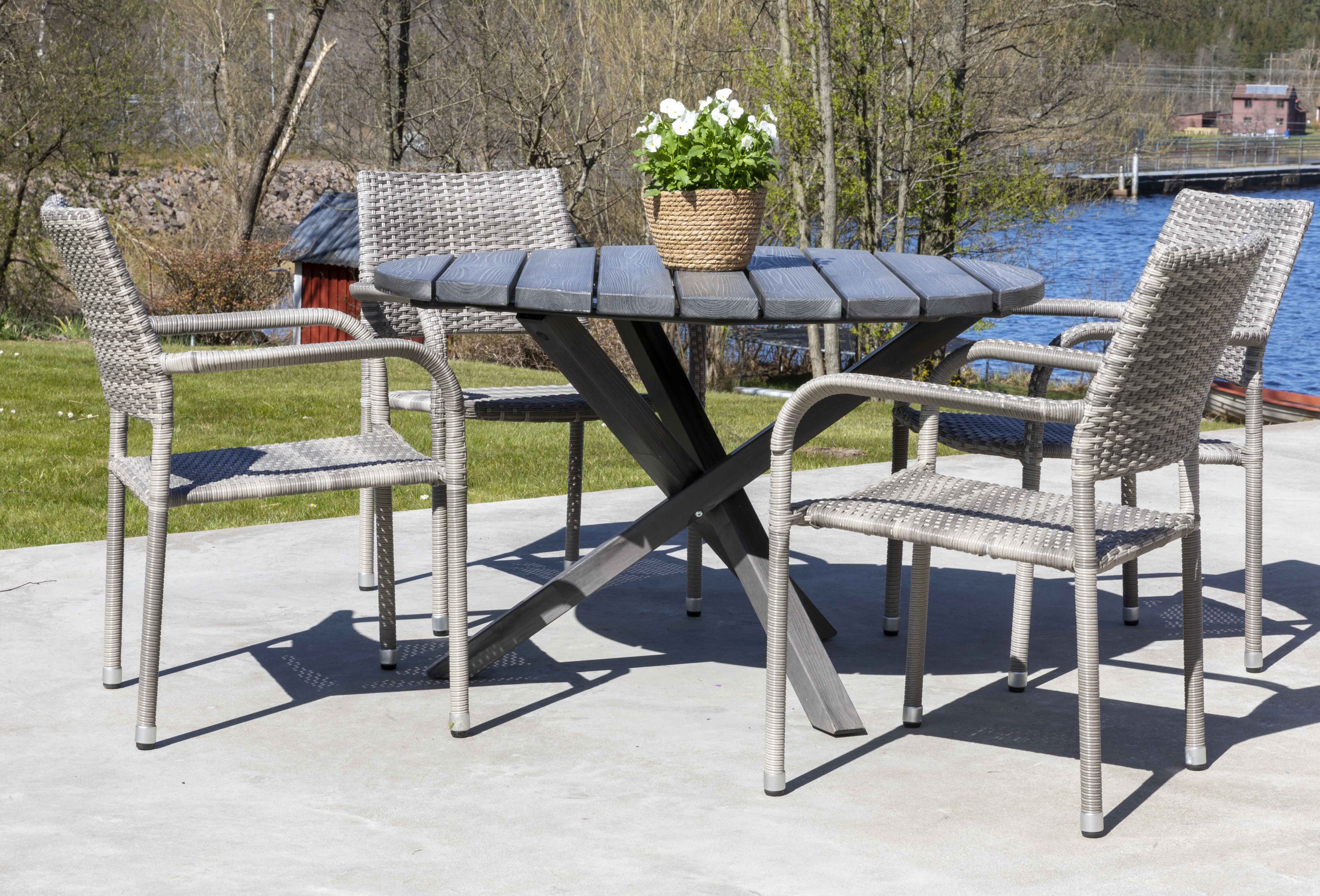 Vancouver spisegruppe gir deg en utemøbelgruppe i nøytral gråmelert kunstrotting som passer fint i hagen. Møbelgruppen består av et rundt solid spisebord med 4 matchende stabelbare karmstoler.