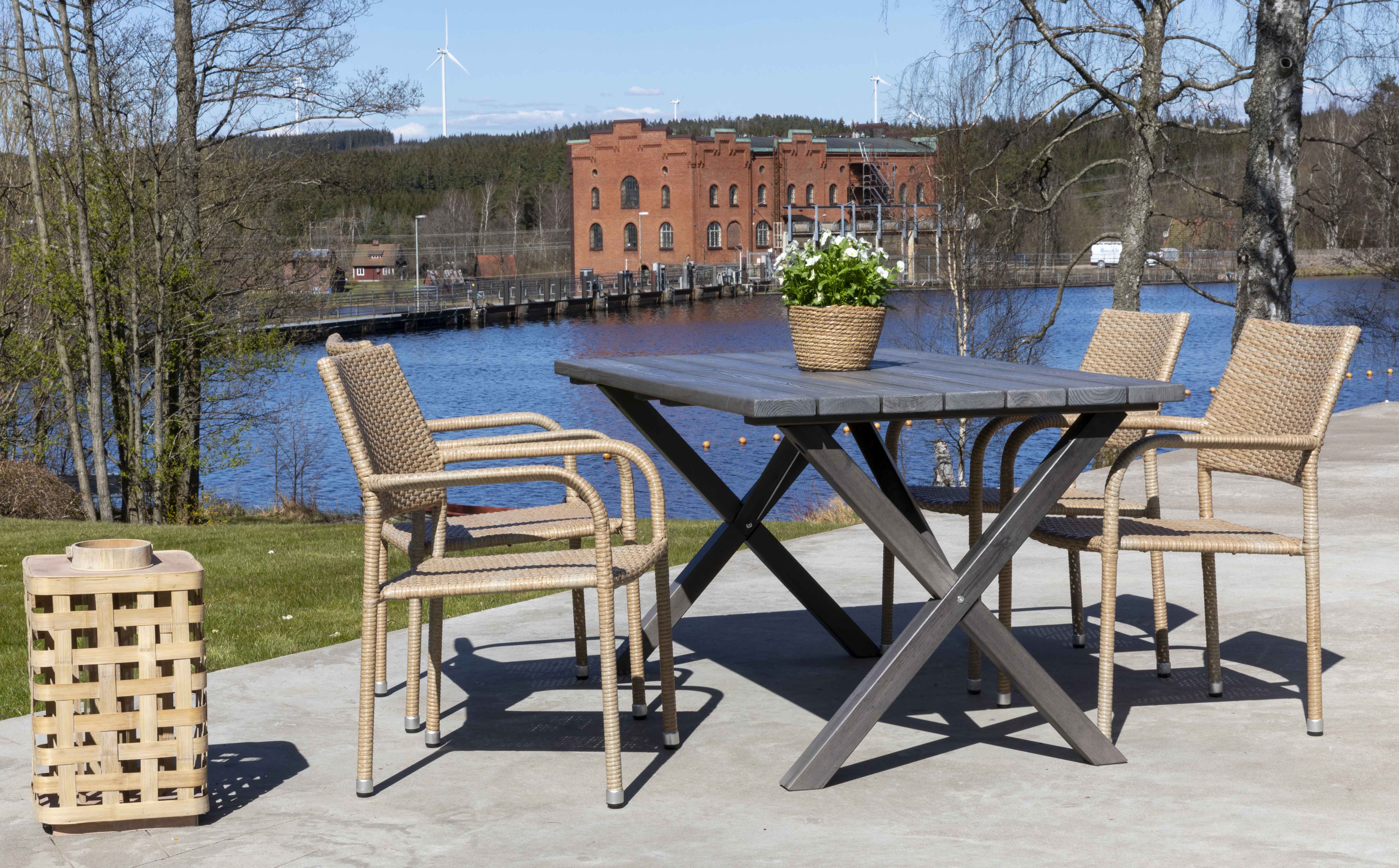 Vancouver spisegruppe gir deg en utemøbelgruppe i nøytral naturfarget kunstrotting som passer fint i hagen. Møbelgruppen består av et rundt solid spisebord med 4 matchende stabelbare karmstoler.
