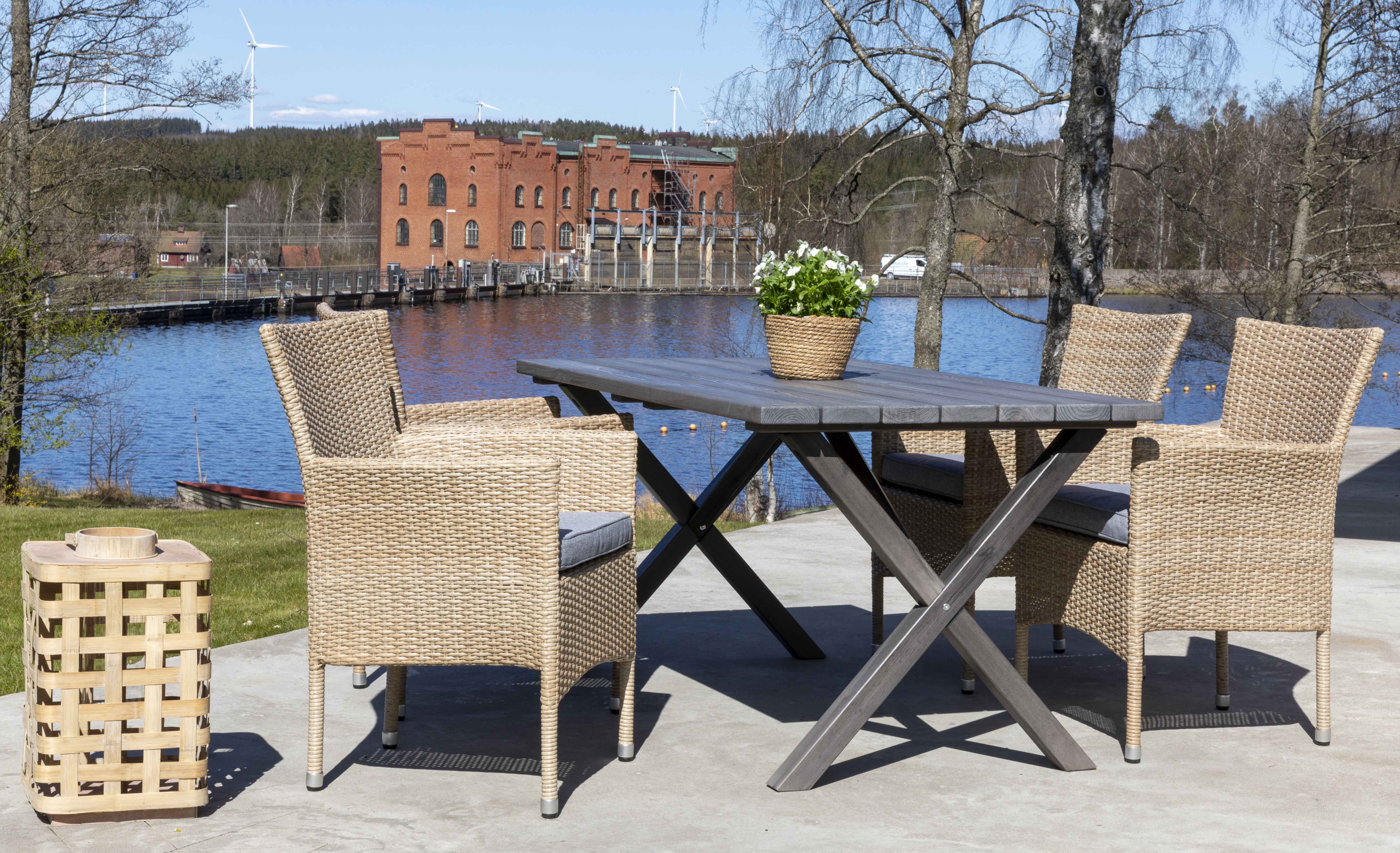 Vancouver spisegruppe gir deg en utemøbelgruppe i nøytral naturfarget kunstrotting som passer fint i hagen. Møbelgruppen består av et solid spisebord med 4 matchende komfortable lenestoler med puter.