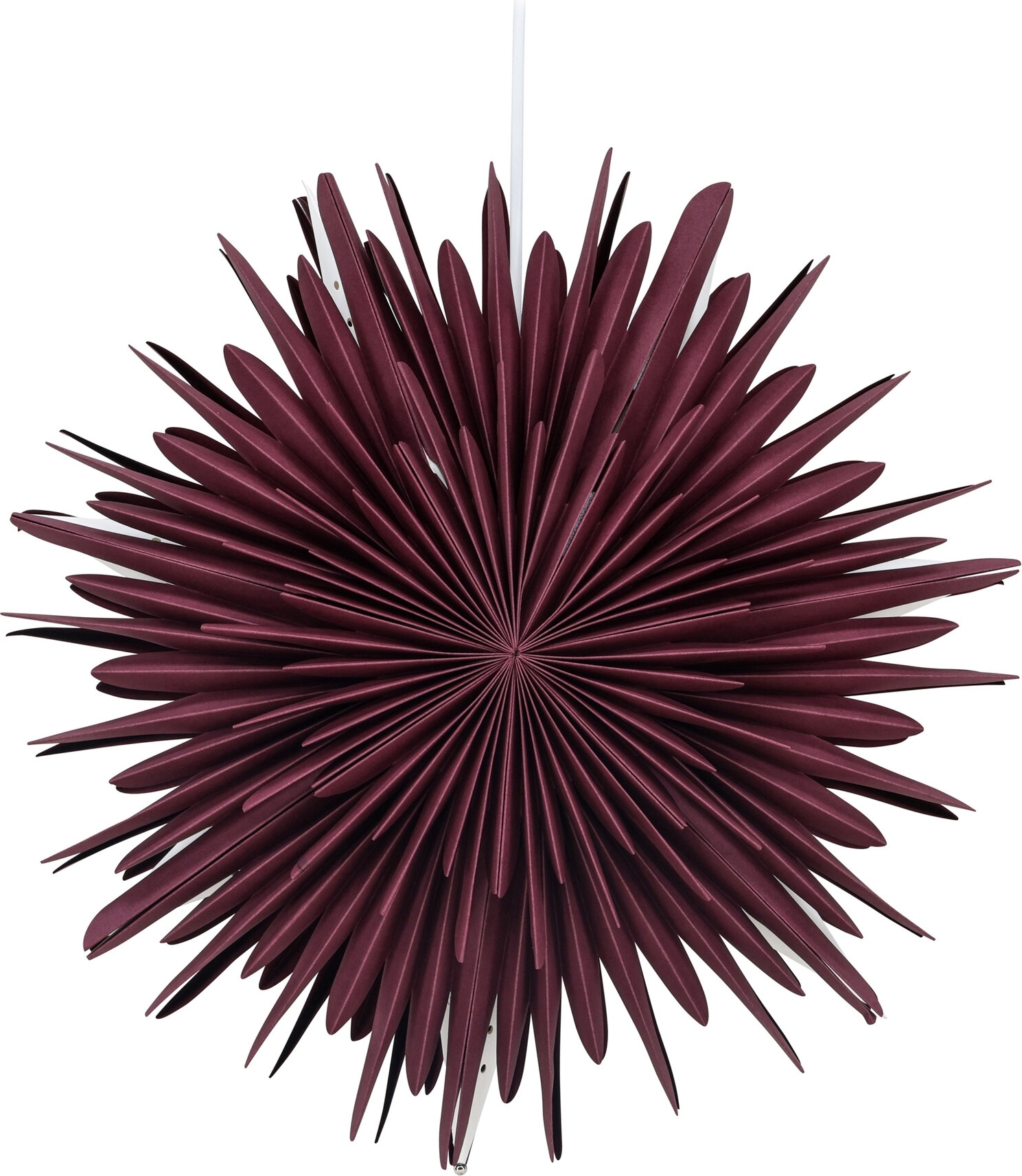 Skap en koselig og hjemmekoselig atmosfære med Sälen taklampe - Perfekt til høst og jul! Denne vakre, mørkerøde papirstjernen vil spre et varmt og koselig lys i rommet ditt, noe som gjør det perfekt for både høstens vakre fargeskift og julens festligheter. Fullfør interiøret ditt på en fantastisk og sjarmerende måte! Sälen taklampe er tilgjengelig i flere forskjellige størrelser for å passe dine behov og rommets dimensjoner. Med sin diskrete hvite ledning smelter lampen elegant inn i ditt interiør og blir en stilig detalj. Den er enkel å installere og vil raskt skape en stemningsfull følelse i hjemmet ditt. Den varme mørkerøde fargen bidrar også til en myk og behagelig belysning som gjør at du føler deg avslappet og glad. Mål: 46 cm.