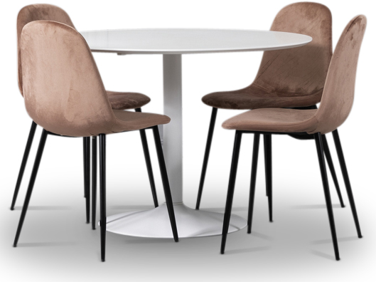 Seat spisegruppe, rundt spisebord med 4 stk Carisma fløyelsstoler - Hvit/Korall