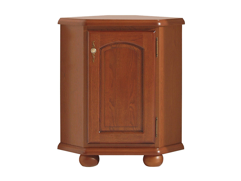 Et praktisk hjørneskap i imitert valnøtt og kastanje. Hjørneskapet passer veldig godt i rom hvor det er begrenset plass. Med sine avrundede former og messinghåndtak vil møblet bli et klassisk innslag i hjemmet ditt. I samme møbelserie er det et overskap som med fordel kan plasseres oppå dette, som til sammen blir et komplett hjørnemøbel.