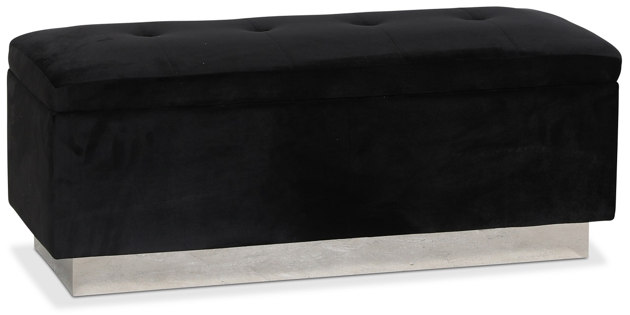Sengekiste med oppbevaring i eksklusiv design. Svart fløyelsstoff med krom detaljer i sokkelen.