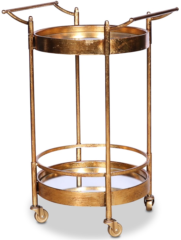 En serveringsvogn med hylle i speilglass. Utførelsen på serveringsvognen er gull.