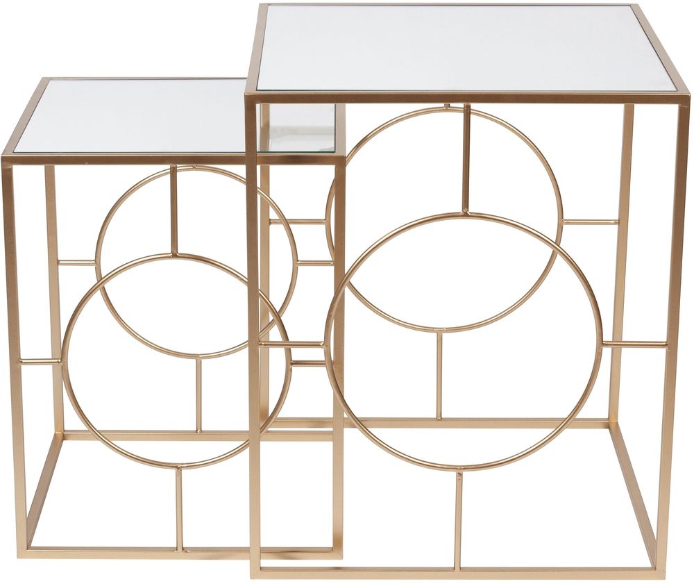 Et par stilige settbord med klassisk design. Sokkelen er laget av gullfarget metall og bordplatene er laget av speilglass. Kommer i sett med to.