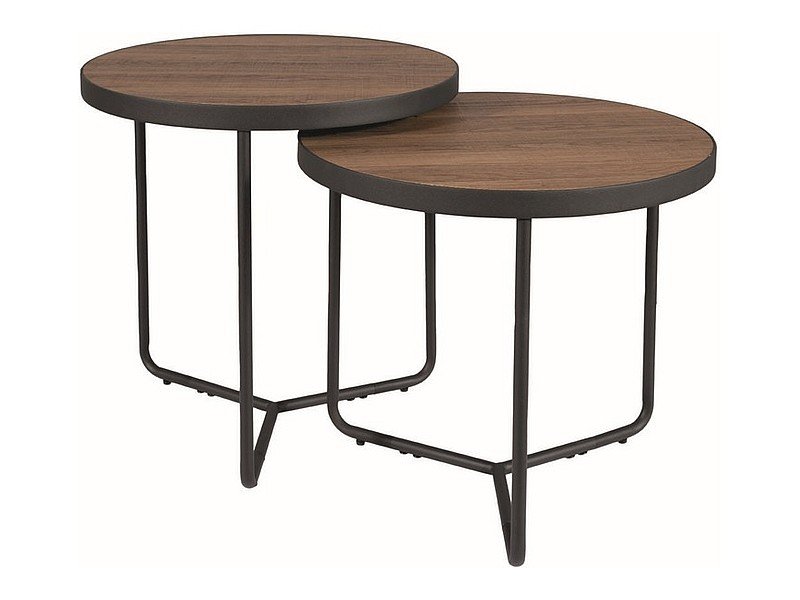 Et par fine sidebord med vintage-design. Bordene er laget av svart pulverlakkert metall med toppplater i valnøttfiner.