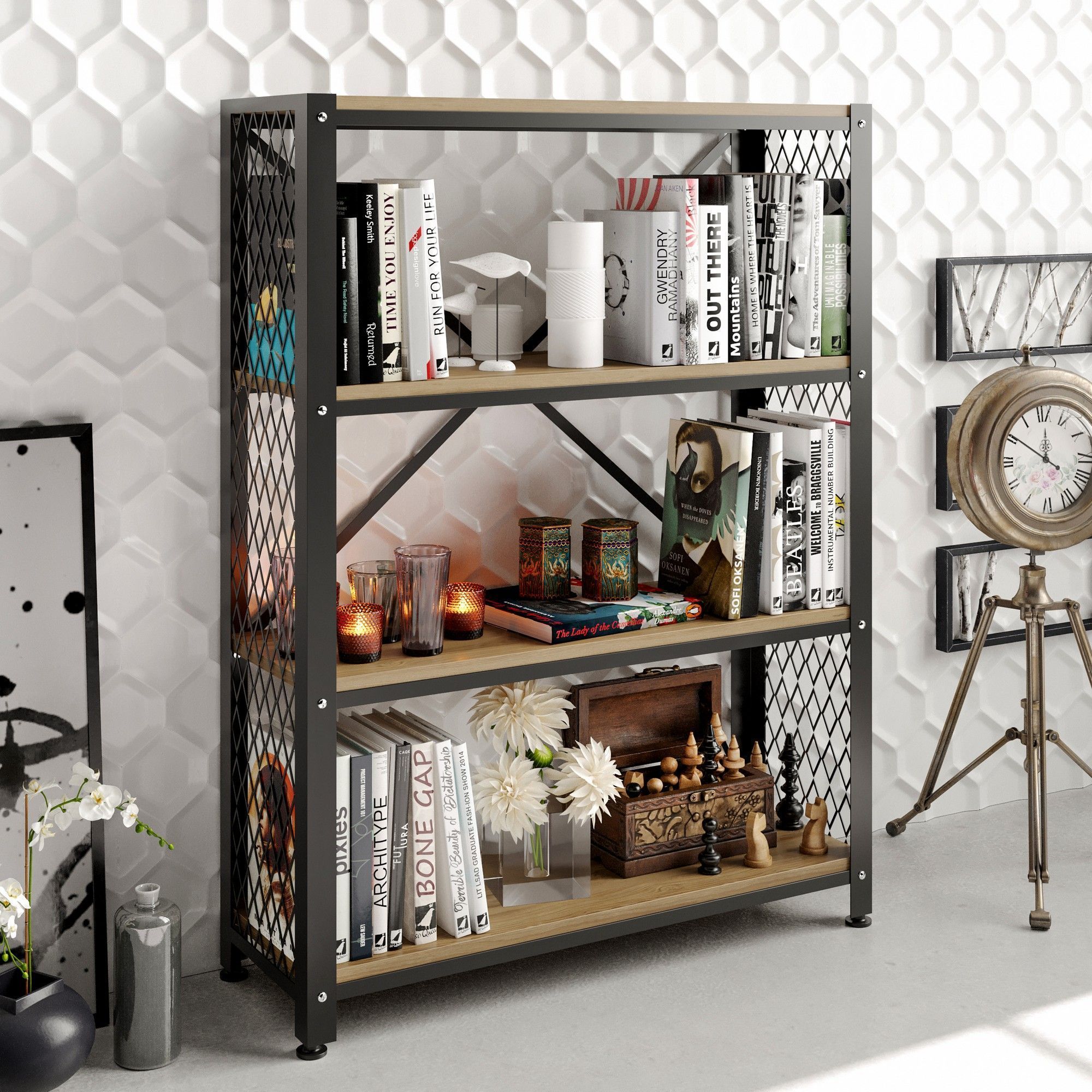 Bokhylle laget av tre og metall.