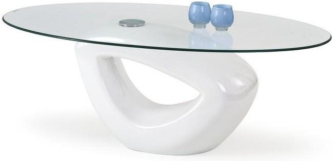 Stilfullt sofabord med et moderne design. Borplaten er av klarglass og underdelen er laget av hvitlakkert glassfiber.