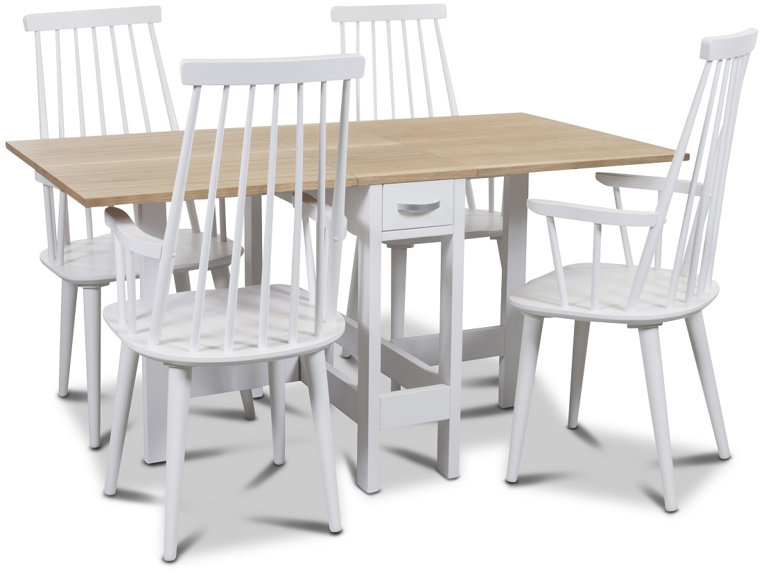 Signum spisegruppe Slagbord hvit/eik med 4 hvite Dalsland stokkstoler med armlener