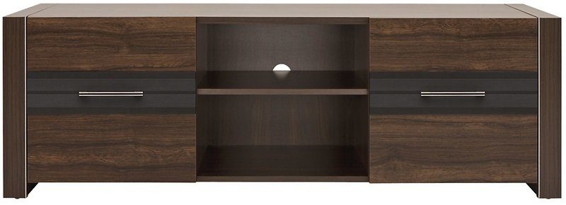 En fin multimediabenk i valnøttsimitasjon med 2 skap og en åpen hylle i midten med to hylleplan.