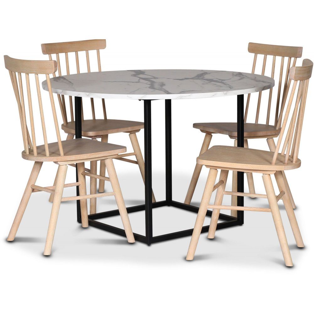 Sintorp spisegruppe, rundt spisebord Ø115 cm inkludert 4 stk. hvitoljede Orust pinnestoler - Hvit marmor (Laminat)