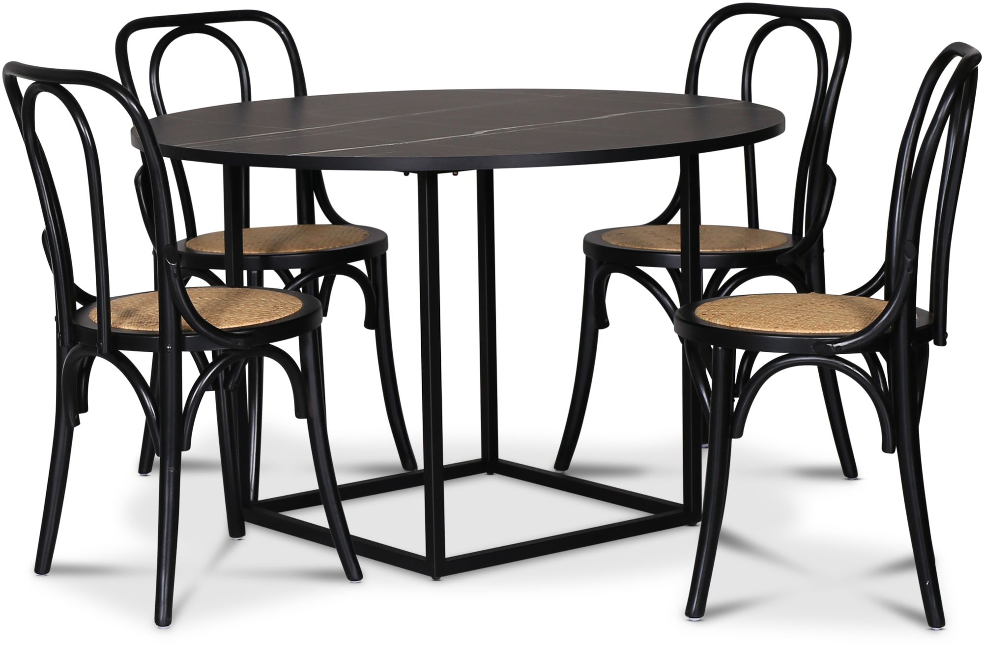 Sintorp spisegruppe, rundt spisebord Ø115 cm inkludert 4 stk. Samset stoler i bøyd tre - svart marmor (laminat)
