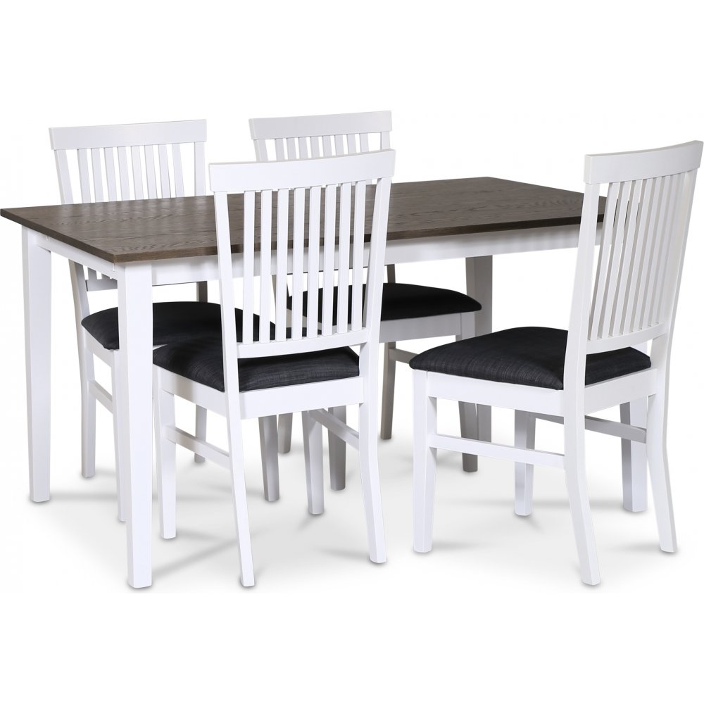 Skagen spisegruppe; klassisk spisebord 140x90 cm - Hvit / brunoljet eik med 4 Fårö stoler (Ribber i ryggen) med grått stoffsete