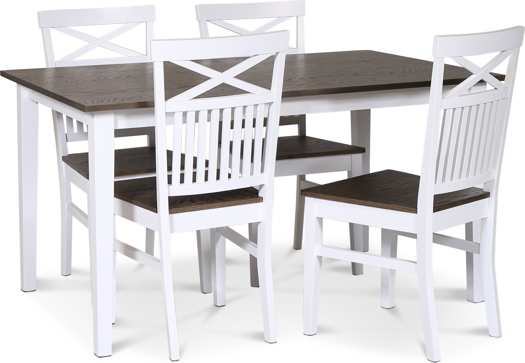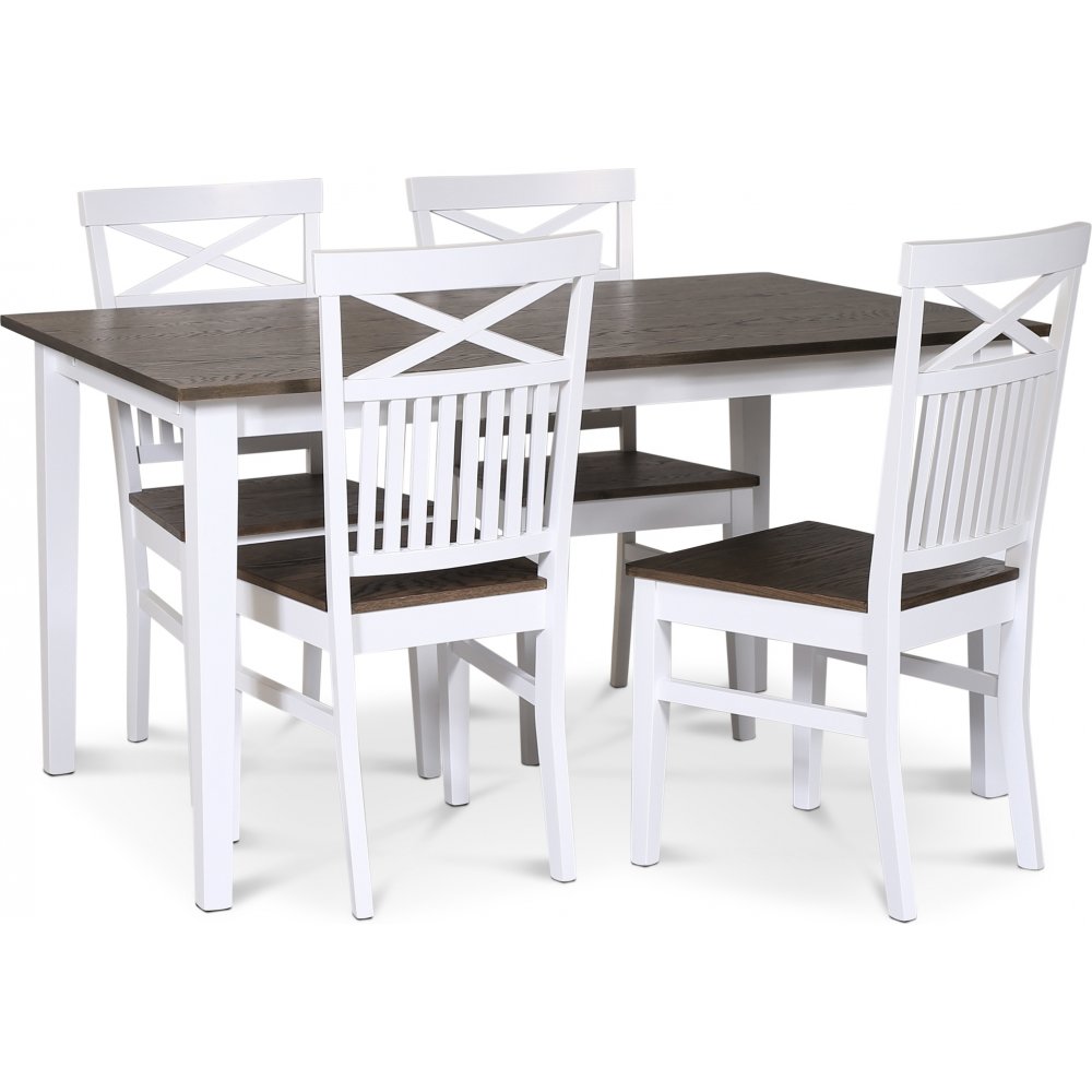 Skagen spisegruppe; klassisk spisebord 140x90 cm - Hvit / brunoljet eik med 4 skagen stoler (Kors i ryggen) med brunoljet eikese
