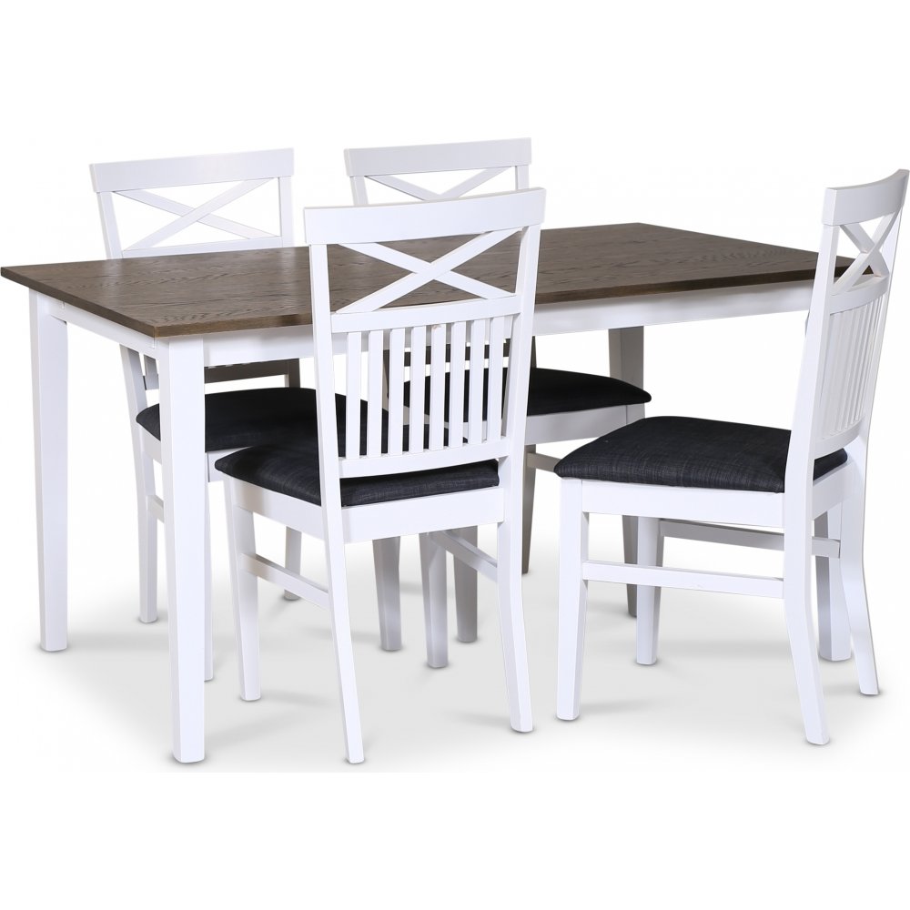 Skagen spisegruppe; klassisk spisebord 140x90 cm - Hvit / brunoljet eik med 4 Skagenstoler (Kryss i ryggen) med grått stoffsete