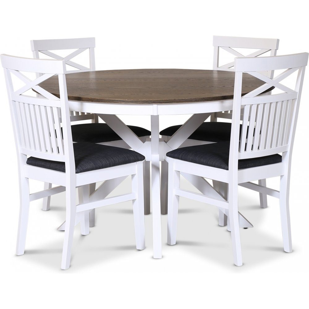 Skagen spisegruppe; rundt spisebord Ø120 cm - Hvit / brunoljet eik med 4 skagenstoler med grått sete: