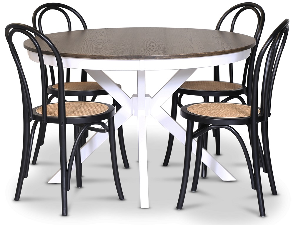Skagen spisegruppe; rundt spisebord 120 cm - Hvit / brunbeiset eik med 4 stk Danderyd No.18 stoler Svart