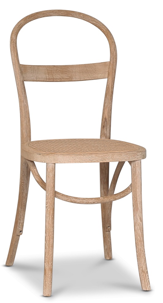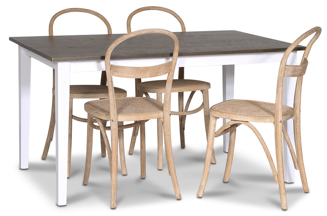 Skagen spisegruppe fra Skånska Möbelhuset, klassisk spisebord 140 cm med hvitt understell og en bordplate i brunbeiset eikefiner. Det inkluderer 4 matchende Danderyd spisestoler i børstet whitewash tre med rottingsete.