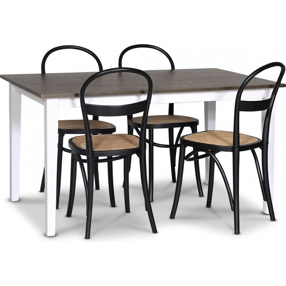 Skagen spisegruppe fra Skånska Möbelhuset, klassisk spisebord 140 cm med hvitt understell og en bordplate i brunbeiset eikefiner. Det inkluderer 4 matchende Danderyd spisestoler i svartlakkert tre med rottingsete.
