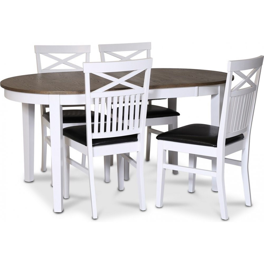 Skagen spisegruppe fra Skånska Möbelhuset, klassisk spisebord 160/210x90 cm med hvitt understell og en bordplate i brunoljet eikefiner. Det inkluderer 4 matchende Fårö spisestoler med et kryss i ryggen, hvitlakkert tre med sete i svart PU.
