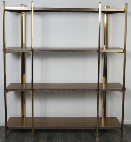 Stor og moderne hylle med ramme i messingsfarget metall og hylleplan kledd i brunt slangelignende kunstlær.