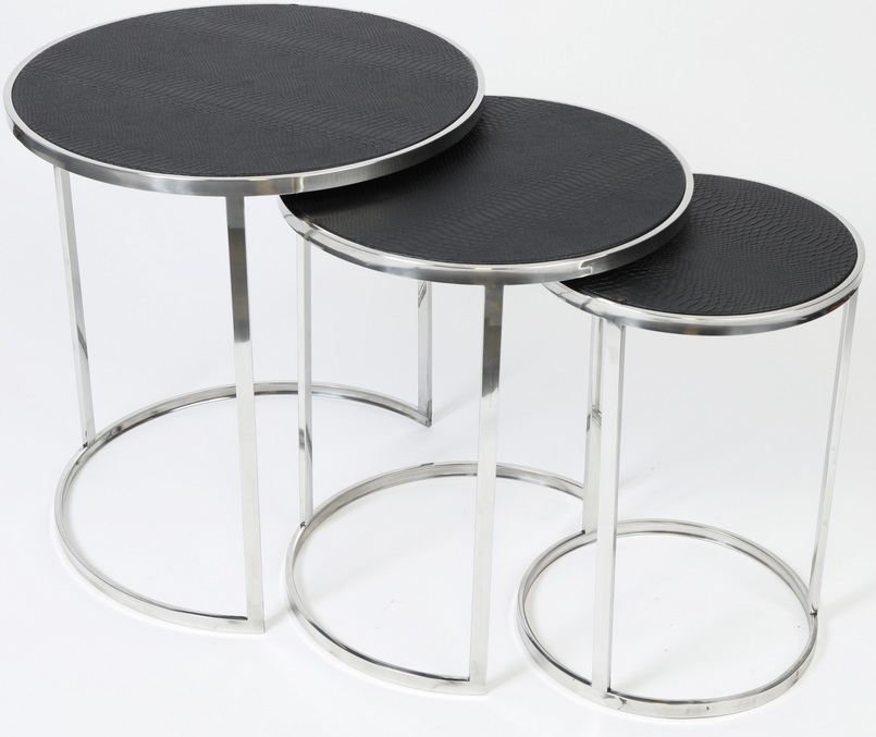Snake rundt satsbord med sitt tøffe utseende med sine bordplater i sort slangelignende kunstlær og understell i krom.