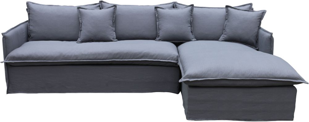 Sofa Delfi er kledd med et grått fiberstoff og er skumstoppet for god komfort. Stamme av massivt tre. Finnes også som venstrevendt.