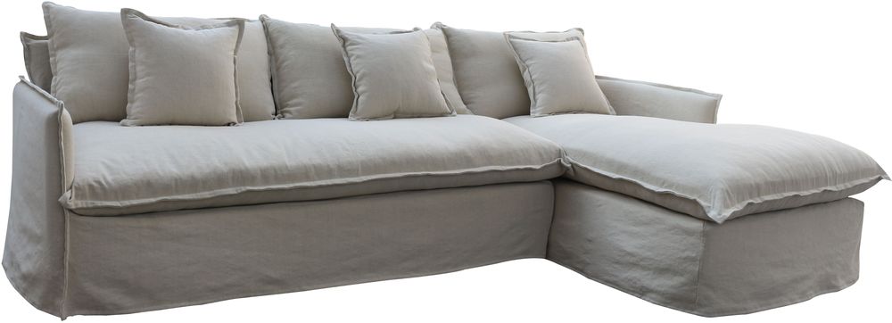 Sofa Delfi er kledd med et beige fiberstoff og er skumstoppet for god komfort. Stamme av massiv furu. Finnes også som venstrevendt.