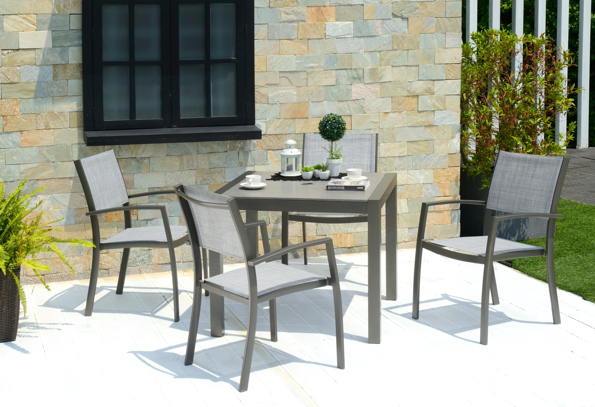 Spisegruppe med spisebord (88x88 cm) og 4 stablebare spisestoler.