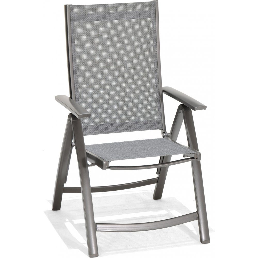 Posisjonsstol med ramme i lakkert, antrasittgrå aluminium, rygg og sete i matchende tekstil og armlener i aluminium.