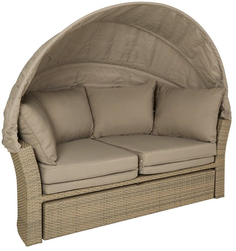 En solseng i denne varianten kan komme godt med på late, trivelige sommerdager. Lite tak som gir skygge fra stolen. Den nedre delen kan slås ut til en sirkulær sofa. Rammen er laget av aluminium, dekket med brun syntetisk rotting. Inkludert puter.