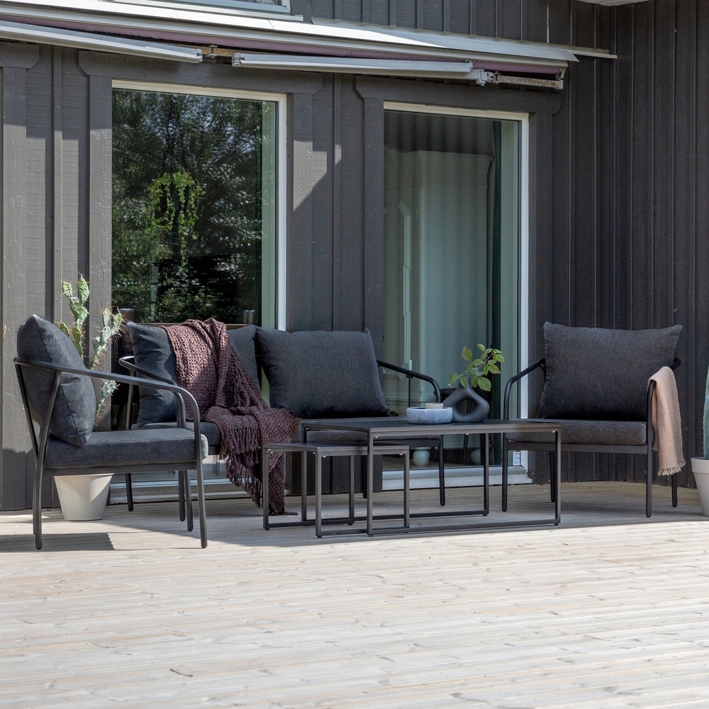 Sopotgruppen Sopot kombinerer stilig design med høy komfort - skap den perfekte atmosfæren på terrassen din i sommer! Två Sits sofa og lenestoler har rette nordiske former med svart stålramme og matchende salongbord er inkludert. Møbler uteplassen med en innbydende sofagruppe og få den stilige loungegruppen. Pleieråd: Stål er et materiale som er motstandsdyktig mot smuss og væsker. Man må imidlertid være klar over at vann vil forårsake flekker og rust. Sørg derfor for å tørke av overflaten med en myk fuktig klut og såpevann, for å unngå at materialet ruster.