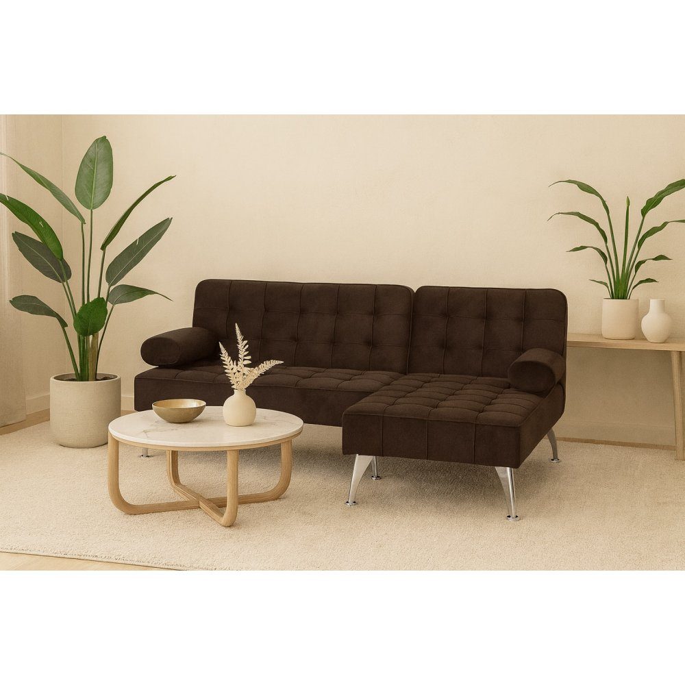 En stilig og praktisk sovesofa som kombinerer moderne design med smart funksjon. Sofaen er trukket i myk brun fløyel og har et pikét sete og rygg som gir et elegant og tidløst preg.
