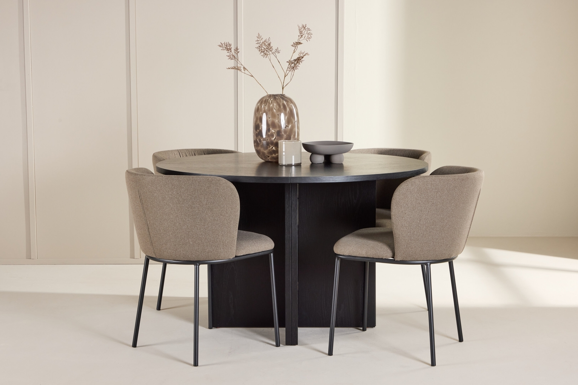 Forvandle spisestuen din med dette stilige spisesettet, som består av det elegante Strada-spisebordet og de komfortable Edina-spisestolene. Sammen skaper de en harmonisk og innbydende atmosfære, perfekt for både hverdagsmat og større sammenkomster. Strada spisebord kombinerer moderne design med fleksibilitet. Bordet er laget av svart finertre og gir en sofistikert og tidløs følelse som passer i mange interiørstiler. Bordet har en original diameter på 120 cm, noe som skaper en intim spiseplass, men kan enkelt utvides til 170 cm for å gi ekstra plass til større arrangementer. Den praktiske utvidelsesfunksjonen lar deg raskt tilpasse bordet til dine behov, noe som gjør det både praktisk og stilig. Edina spisestuestolene er trukket i et vakkert brunt linstoff som gir et rustikk og naturlig preg. Den varme bruntonen tilfører en jordnær eleganse og passer perfekt i ulike interiørstiler, fra skandinavisk minimalisme til klassisk sjarm. Det ergonomiske designet gir god støtte under lange middager, mens den robuste konstruksjonen og det slitesterke linstoffet sørger for langvarig holdbarhet. Sammen gir Strada spisebord og Edina spisestoler en perfekt balanse mellom funksjon og stil. Bordkonstruksjonen i svart finertre komplementeres vakkert av stolenes varme toner, og skaper et elegant og innbydende miljø for hvert måltid. Enten du samler familien til en hverdagsmiddag eller inviterer dem over på et festmåltid, vil dette spisesettet bli en sentral og stilig del av hjemmet ditt.