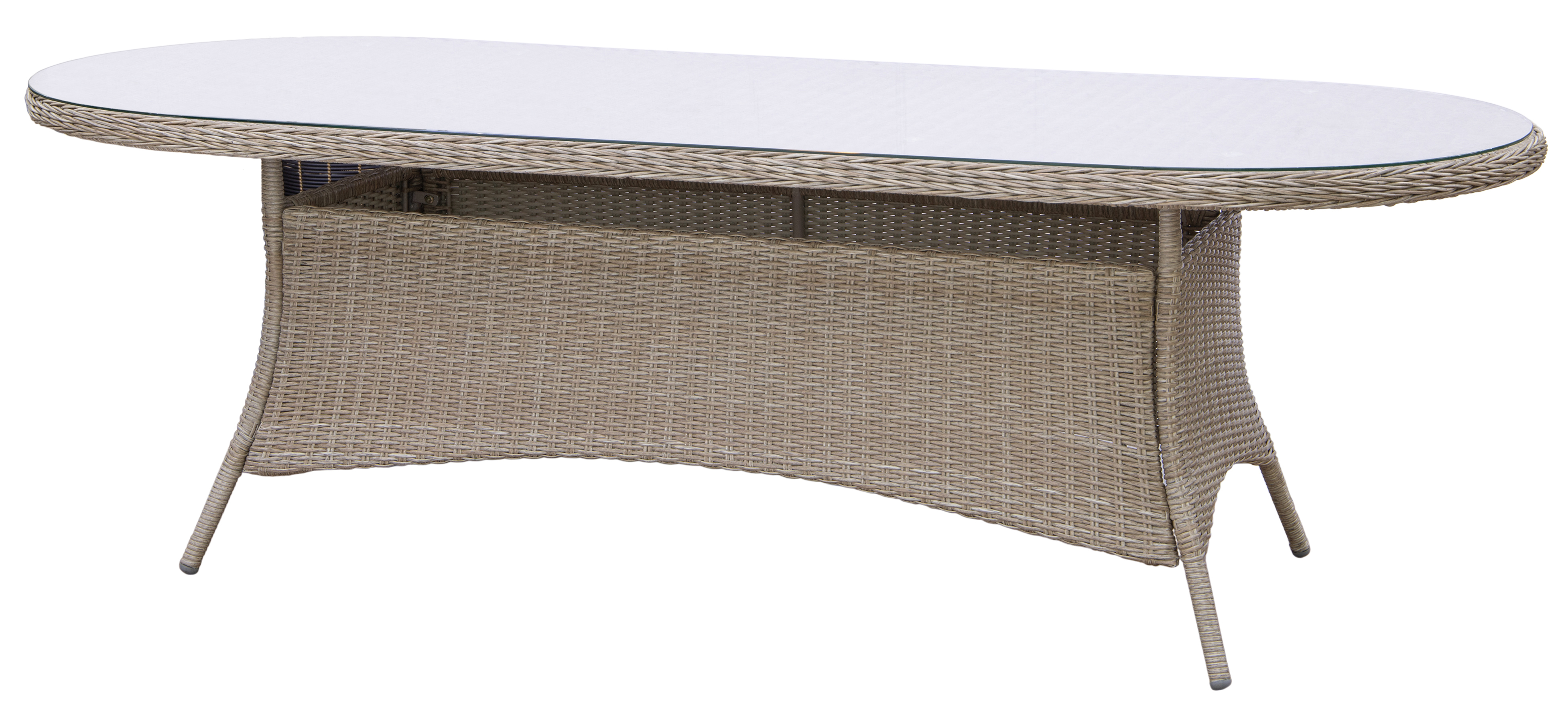 Dette spisesettet har et bord i naturfarget syntetisk rotting med en bordplate i herdet glass, som gir en slitesterk og lettstelt overflate for utendørs bruk. Bordet er kombinert med komfortable lenestoler som har en halvsirkelformet kunstrotting og polstrede puter for ekstra komfort. Bordet tilhører Menton-serien, mens lenestolene er fra Mercury-serien, som kjennetegnes av sitt klassiske design og stabile aluminiumsramme.