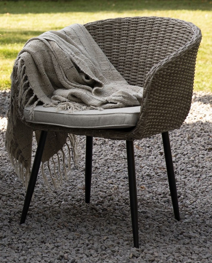 Utegruppe Aster: Scottsdale rundt grå/hvitt spisebord Ø112 cm inkludert 4 Aster lenestoler med sitteputer. En spisegruppe i harmoni hvor møblene går fint sammen og skaper en helhet som er vanskelig å slå. Passer like godt i uterommet som på plenen.