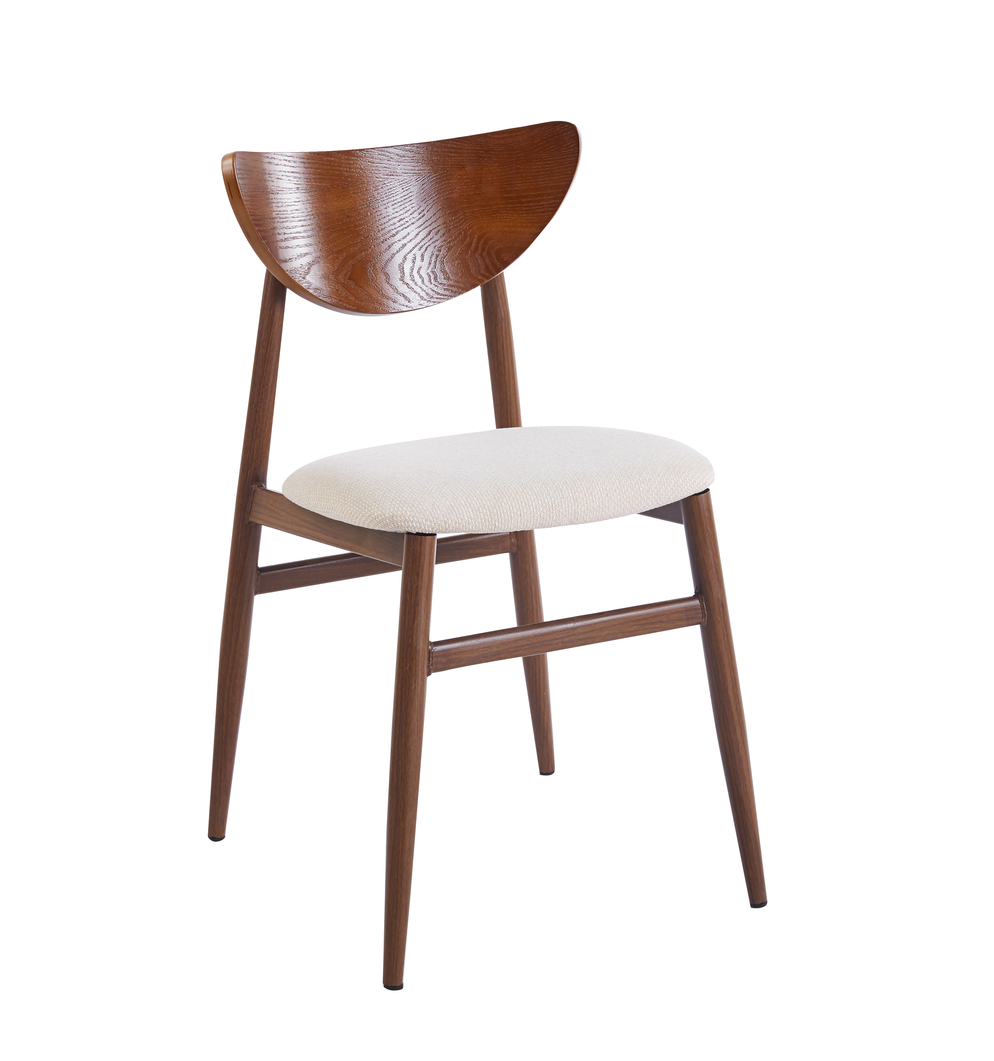 Bordet er matchet med fire Ludvig spisestoler i et harmonisk samspill av valnøttbrune toner og beige stoff . Det mykt polstrede setet gir en komfortabel sitteopplevelse, mens den elegant formede treryggen tilfører naturlig varme og visuell balanse. Rammens valnøttfolierede metall gir stabilitet og et ensartet uttrykk sammen med bordets design.