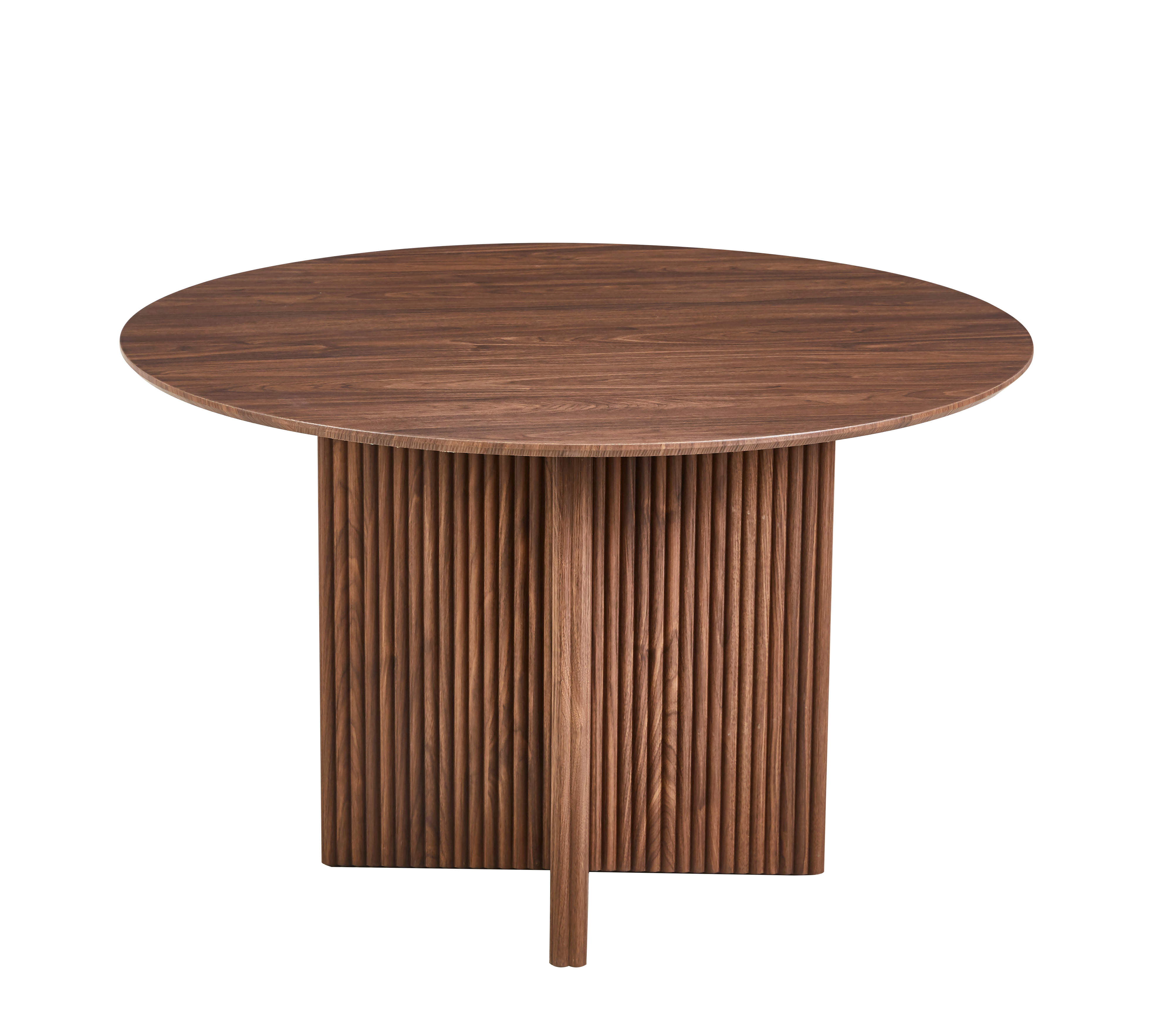 En elegant spisegruppe som kombinerer moderne design med varm valnøttpreg. Crossby spisebord har en rund bordplate i valnøttfinert MDF og dekorative riflede treben som gir det et eksklusivt og moderne preg. Den avrundede formen skaper et sosialt og innbydende samlingssted som passer perfekt til både hverdagsmiddager og festlige anledninger.