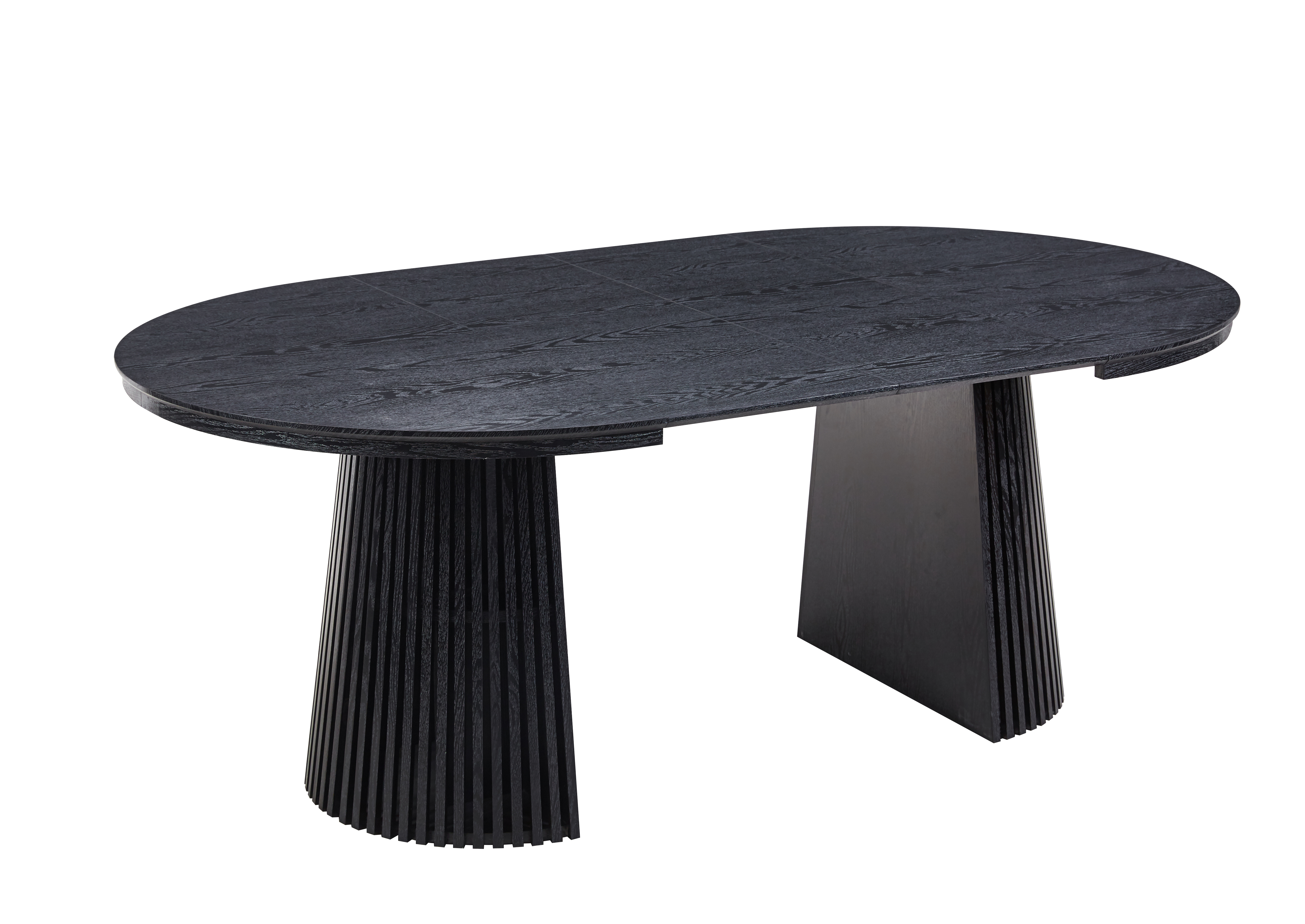 En moderne og fleksibel spisegruppe som kombinerer stilig design med praktisk funksjon. Crossby spisebord har en rund bordplate i svartbeiset eikefinert MDF og dekorative riflede treben , noe som gir det et elegant og moderne utseende. Bordet er uttrekkbart og kan enkelt trekkes fra hverandre for å få plass til flere gjester - takket være de to medfølgende forlengelsesplatene på 50 cm kan bordet forlenges fra 120 cm til hele 200 cm i lengde. Perfekt for de som ønsker å kunne tilpasse spiseplassen til sine behov, fra hverdagsmiddag til fester.