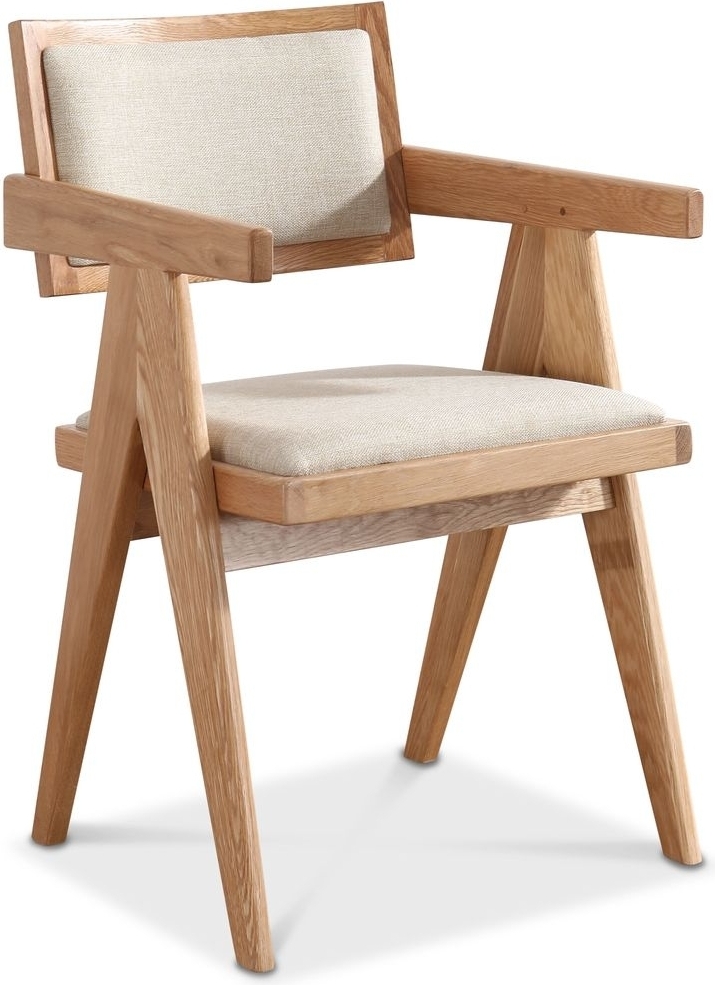Sara lenestoler er laget av FSC-sertifisert heltre eik og trukket i et linfarget stoff som skaper en varm og innbydende følelse. Det integrerte armlendesignet gir ekstra komfort, mens de rene linjene og naturlige materialene gjør at stolene passer perfekt til bordets klassiske form.