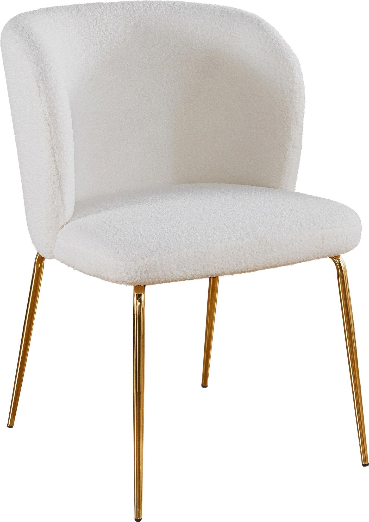 Stolene er trukket i kremfarget bouclé-stoff og har en messingbase. Kombinasjonen av et trebord og stoffkledde stoler gir en funksjonell og stilig spiseplass for fire personer.