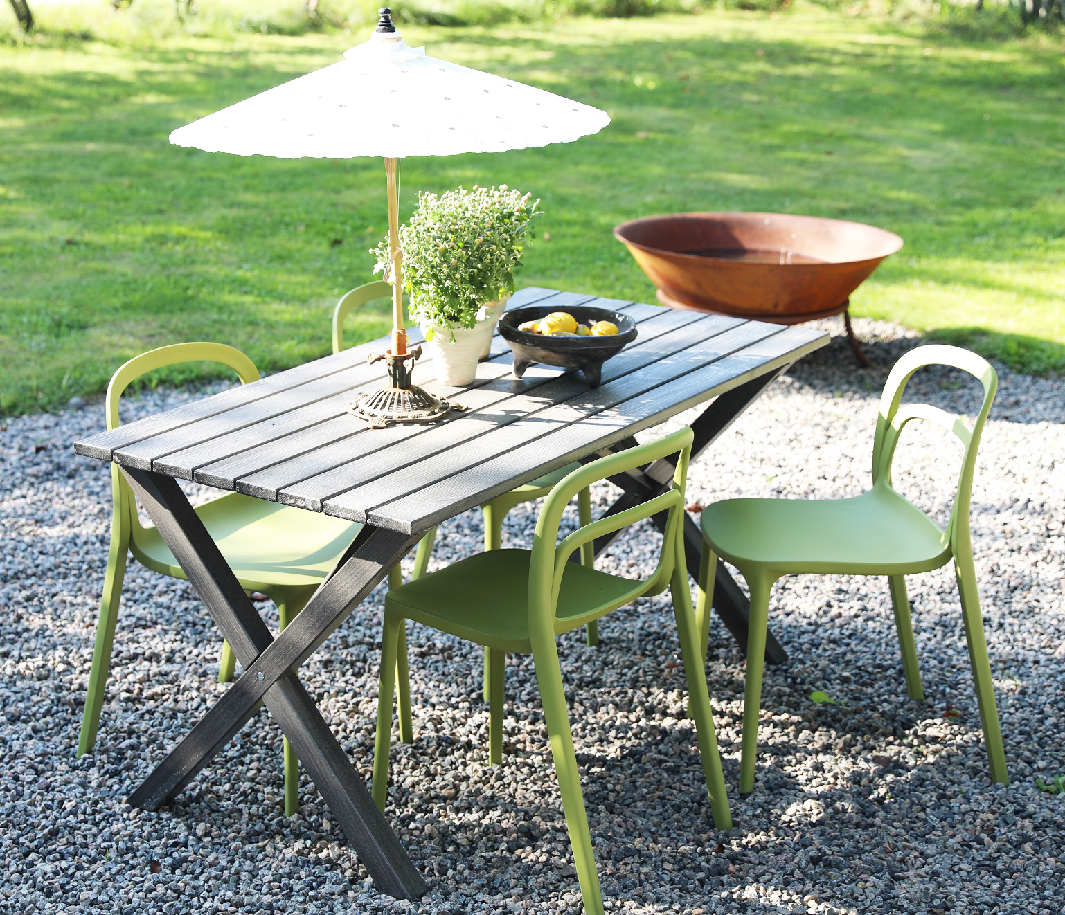 Nett spisegruppe til uteplassen fra Skånska Möbelhuset. Holmsund rundt spisebord Ø103 cm i diameter med hvitlakkert understell og hvit aintwood topplate. Til spisegruppen følger det med 4 stk. stablebare Nordanå stoler i grønn formstøpt plast. En spisegruppe i harmoni der møblene går fint sammen og skaper en uovertruffen helhet. Passer like godt i utestuen som på terrassen.
