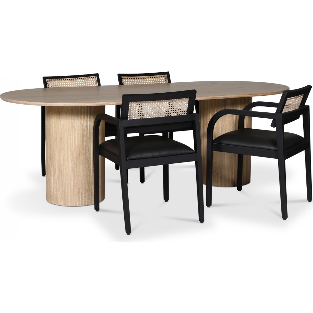 Nordansjö spisegruppe fra Skånska Möbelhuset, ovalt spisebord, i hvitoljet eikefiner med fire Siknäs lenestoler i svartfarget ramme med rotting i ryggen og svart PU i setet.