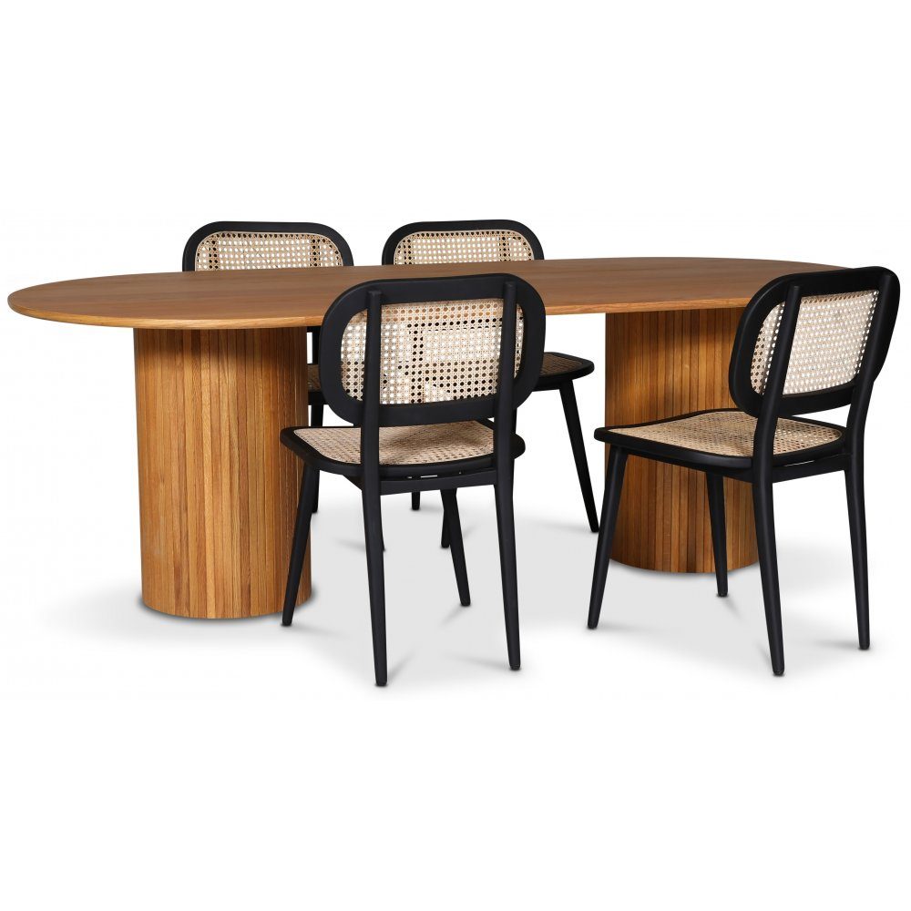 Nordansjö spisegruppe fra Skånska Möbelhuset, ovalt spisebord, i oljet eik med fire Siknäs II stoler i svartlakkert mahogny med rotting i ryggen og sete.