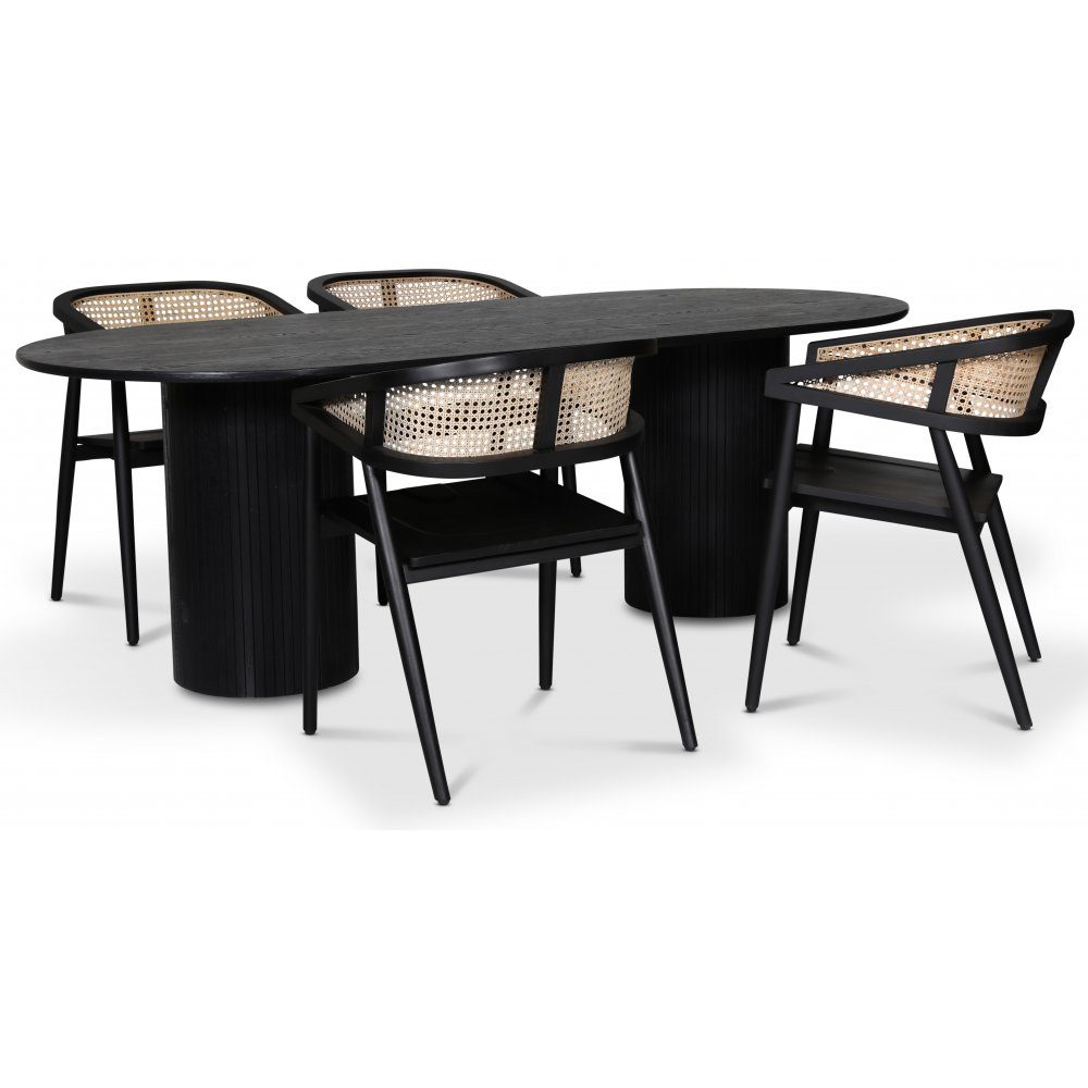 Nordansjö spisegruppe fra Skånska Möbelhuset, ovalt spisebord, i svartbeiset eik med fire Skaraborg lenestoler i svart lakkert mahogny med rotting i ryggen og sete.