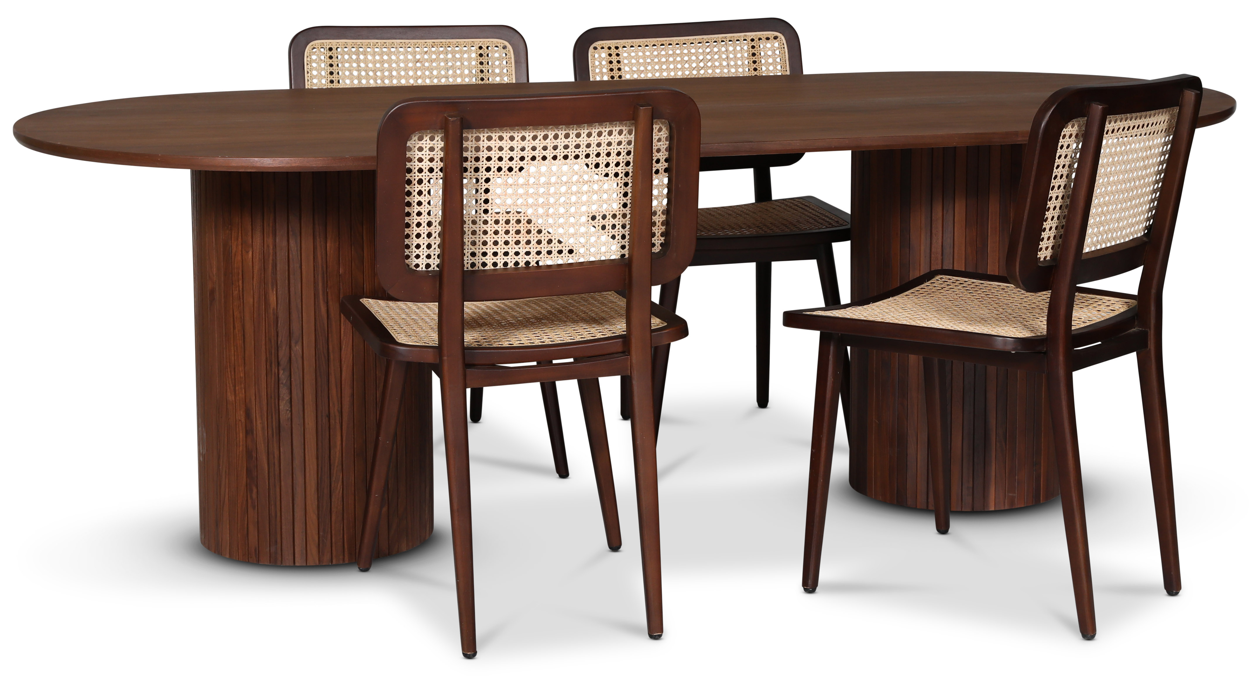 Nordansjö spisegruppe fra Skånska Möbelhuset, ovalt spisebord, i valnøtt med fire Siknäs stoler i brunlakkert mahogny med rotting i ryggen og sete.