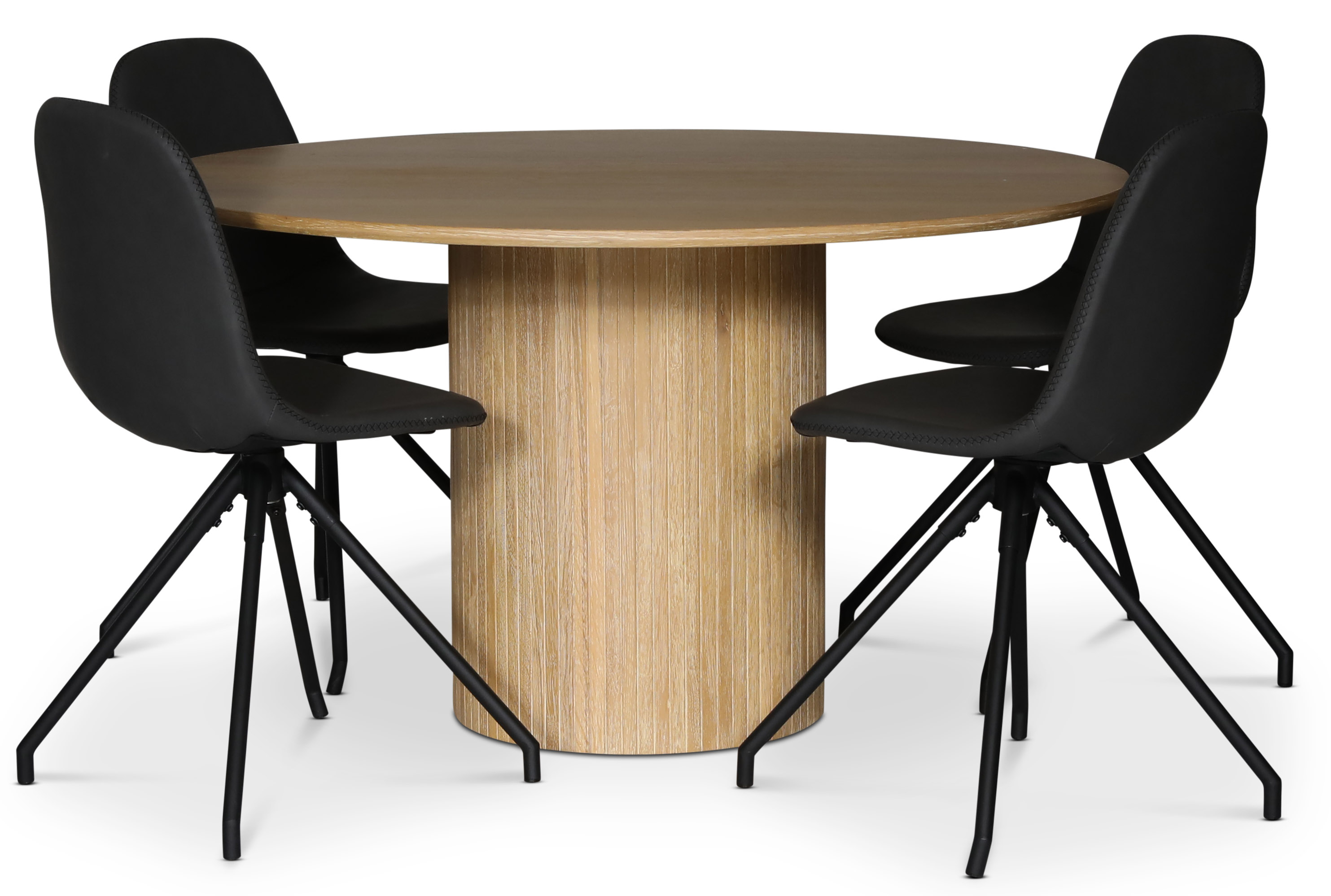 spisegruppe i Nordansjöen; rundt spisebord Ø130 cm + 4 stk Bridge spisestoler, svart PU
