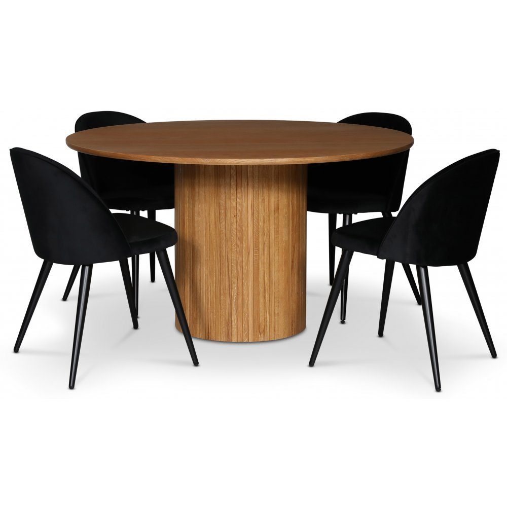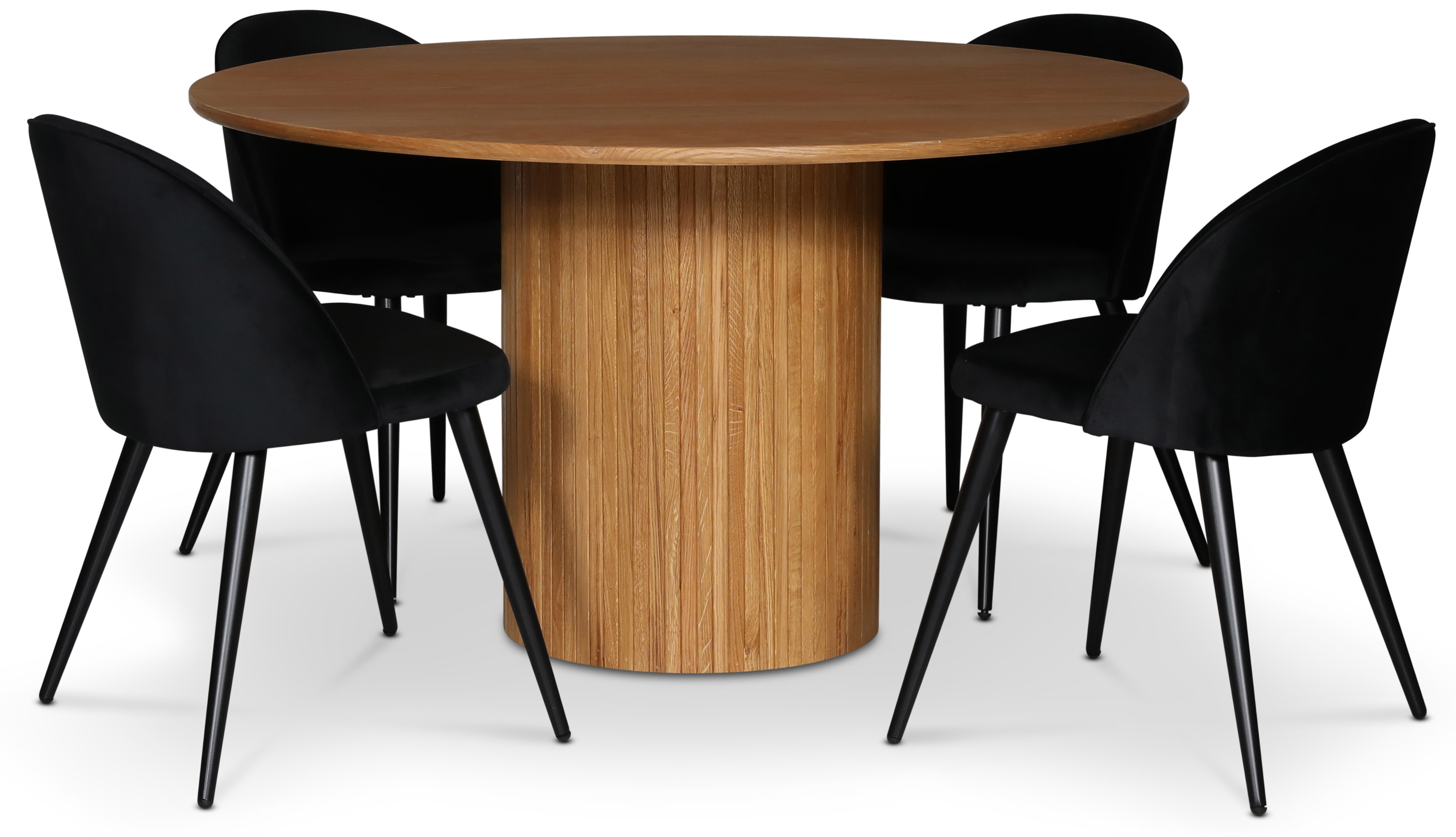 Nordansjö spisegruppe fra Skånska Möbelhuset, rundt spisebord Ø130 cm i diameter, i oljet eikefiner med fire Alice spisestoler i svart fløyel med svarte metallben.